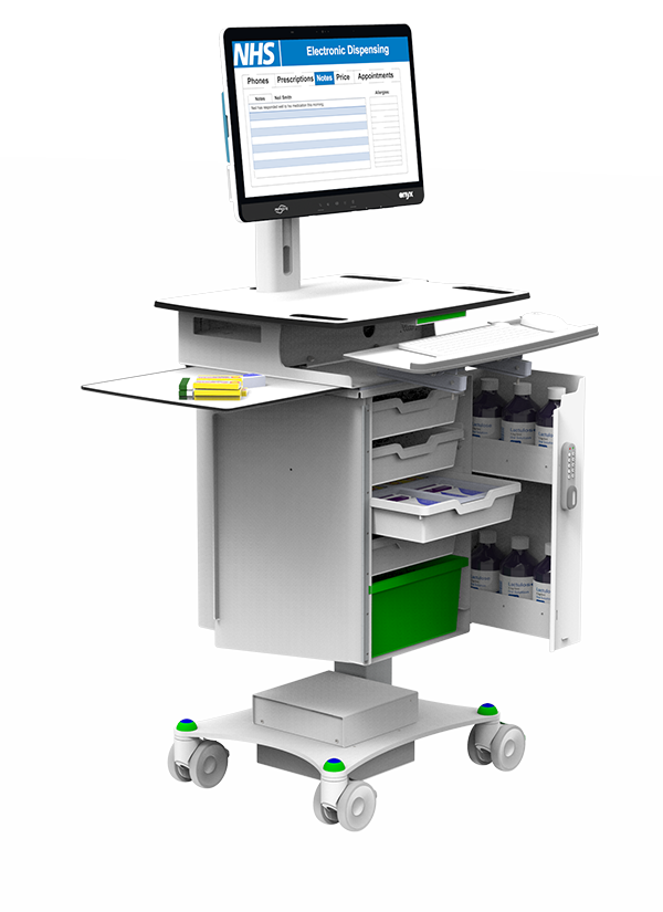 An electric height-adjustable cart with a generous storage capacity, a large worksurface for medicines prep, and a unique, ergonomic design to enhance accessibility to patient information and IT hardware.
